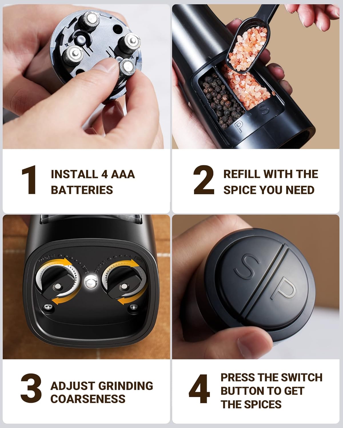 [Dual Oversized Buttons] The automatic single salt and pepper grinder shakers mill features two oversized buttons that are clearly labeled for easy identification and use with both salt and pepper. Ergonomic, one-handed design ensures effortless and convenient operation, allowing you to grind your favorite spices with ease. Plus, Robust performance ensures longevity. Note: If the grinder does not work with the battery installed, please check the polarity of the battery installation
