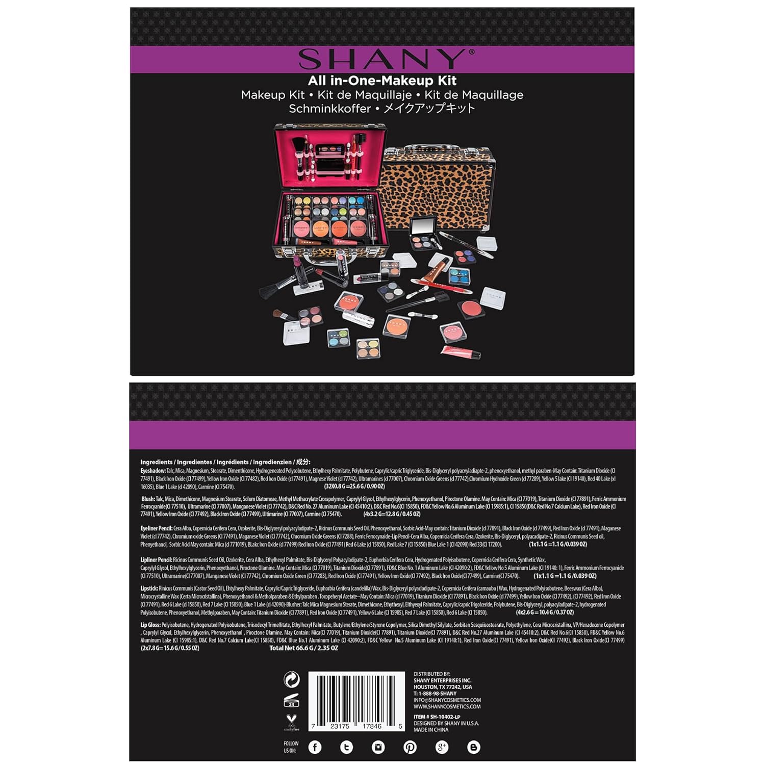 This durable and portable leopard print case by SHANY comes with a variety of stylish / high quality makeup that best fits your on-the-go lifestyle. This case comes with: eight shadow quads with shimmer and matte shades, three dual sided eye shadow sponges, two blushes, one blush brush, one portable blush brush, four full sized lipsticks (two matte two shimmer), one dual-sided lip liner (red and pink), one dual-sided eye liner (black and brown), one dual-sided eyebrow brush/comb. You can take a blush or eye shadow quad in your purse with our miniature mirror compact. This is a great gift for birthdays, holidays, graduations, or any reason to make a beauty smile. For more flexibility and ease of application, use the SHANY Professional 12-Piece Natural Goat and Badger Cosmetic Brush Set with Pouch