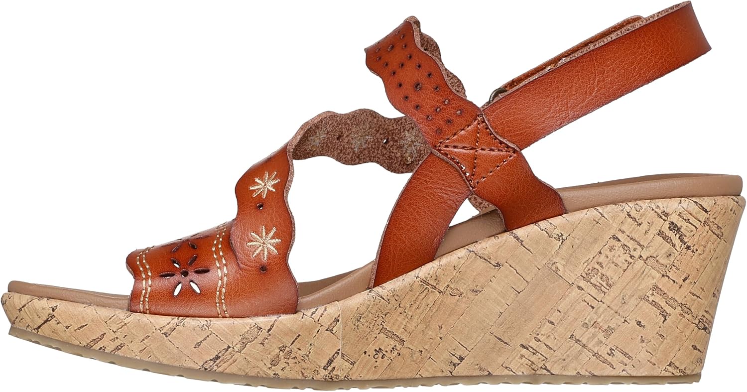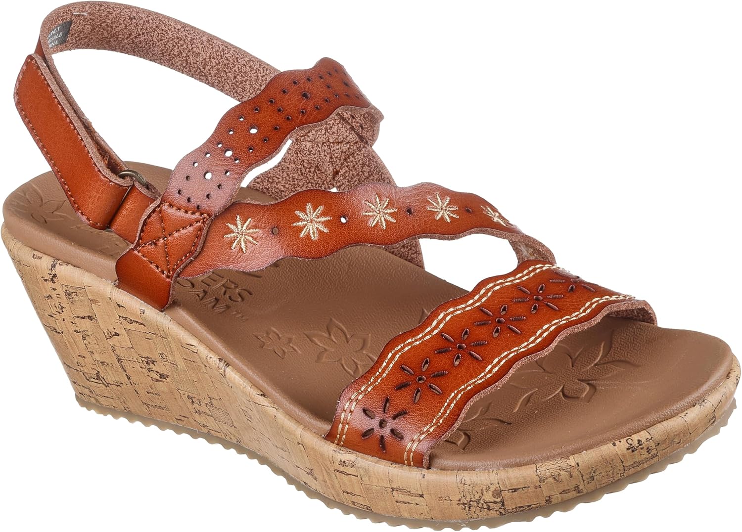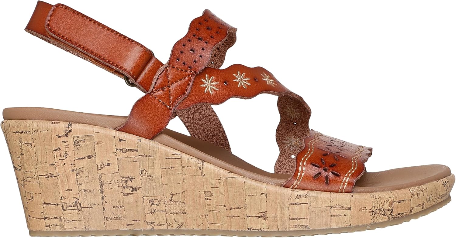 Elevate your summer style with these fashionable womens sandals from Skechers. The Beverlee Cherished Aura wedge sandals combine sophisticated design with all-day comfort. These sandals for women feature a strappy laser-cut vegan leather upper with elegant embroidery detail, complemented by a cork veneer wedge midsole and cushioned Luxe Foam footbed. The adjustable hook-and-loop slingback closure ensures a secure fit, while the flexible traction outsole provides reliable stability.