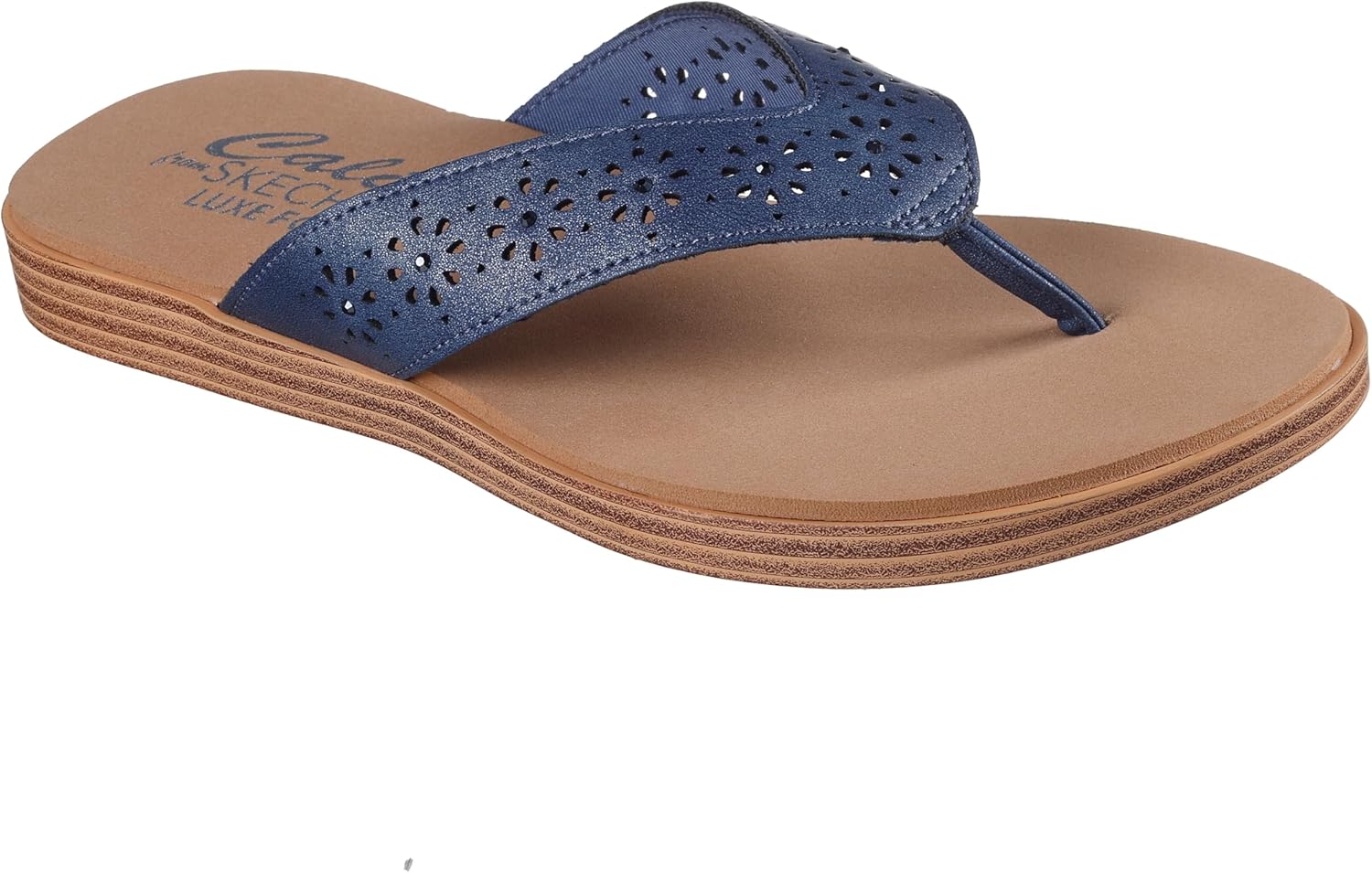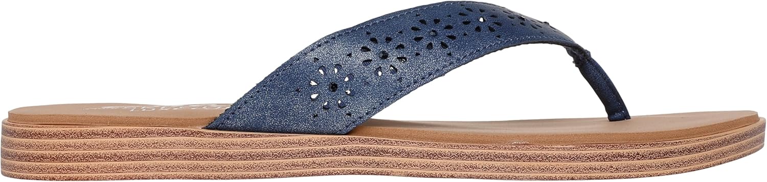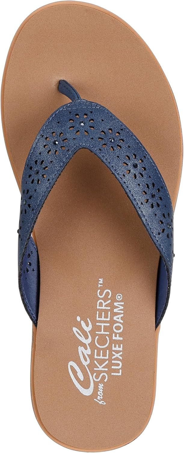 Find your center in pretty style and comfort wearing the SKECHERS Cali Summer Cove flip flop sandal. Laser cut shimmer thong casual comfort sandal with stitching accents and Luxe Foam cushioned footbed.
