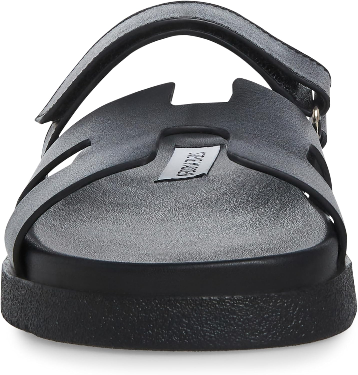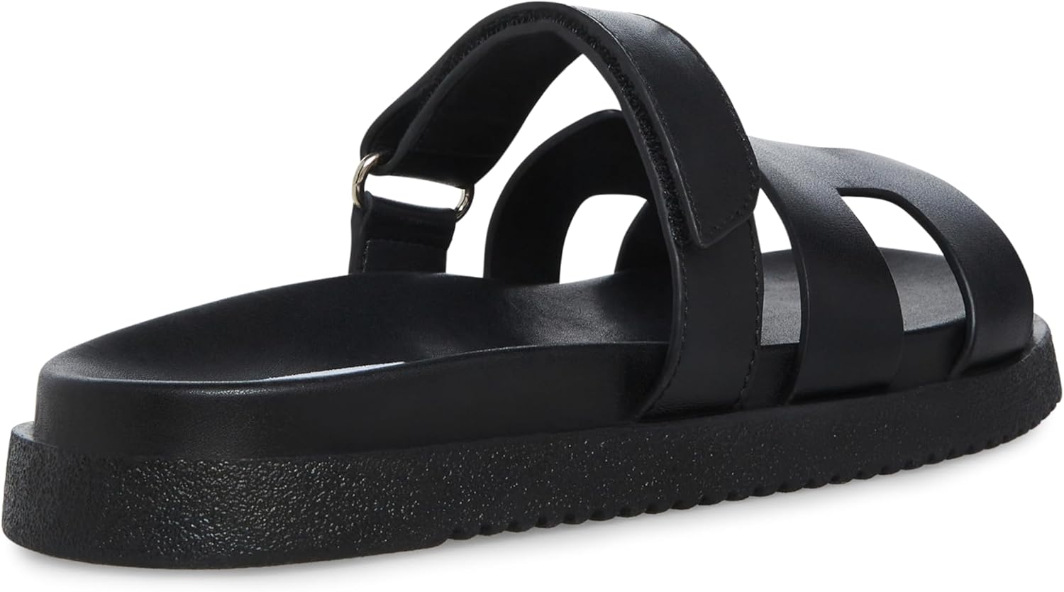The leather MAYVEN slides feature comfy construction details like a molded footbed, a treaded flatform sole, and an adjustable top strap, plus a front strap with a geometric cutout design.