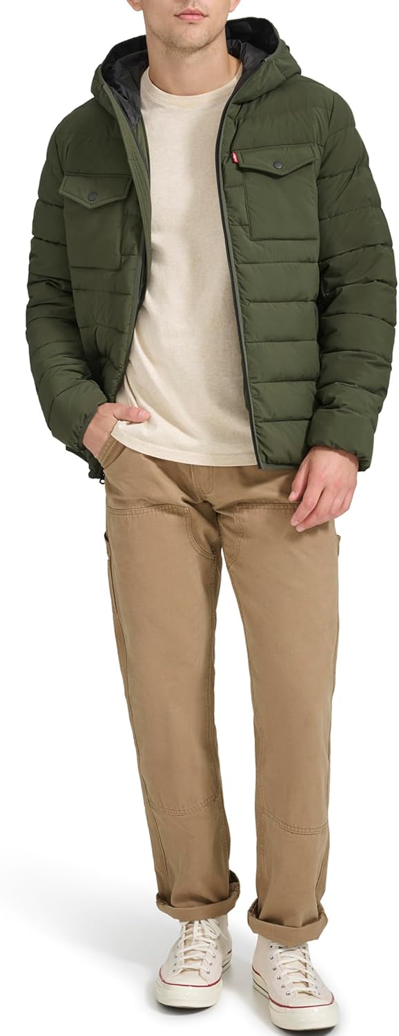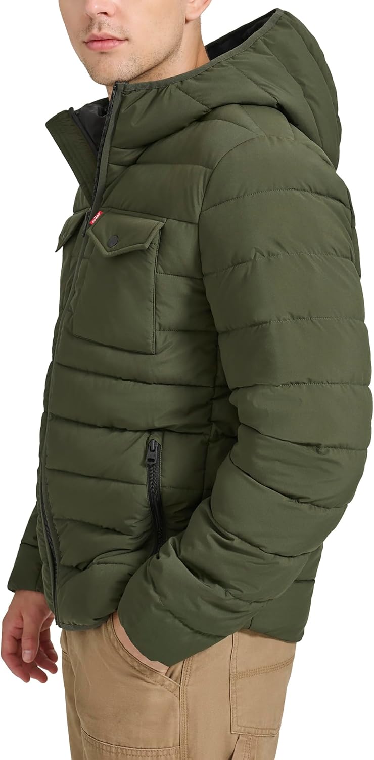 STYLISH FEATURES: Soft stretch fabric, two upper chest pockets, two lower hand pockets, one interior safety pocket, Levi’s red tab logo at left pocket. FUNCTIONALITY: Elastic cuffs and hem for comfort, center front zipper closure. WARMING FEATURES: Quilted panels filled with warm faux down insulation to trap in body heat.